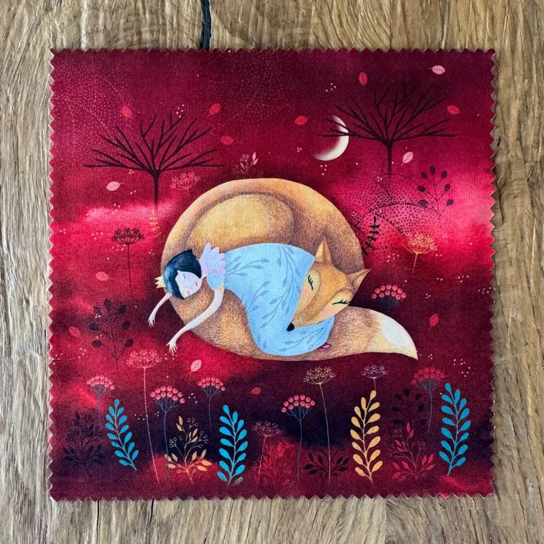 Dieses Tuch wurde von meiner lieben Freundin Noemi gestaltet, deren feines Herz solche Bilder entstehen lässt. Sie lebt in einem kleinen Ort in Frankreich und schafft mit ihren Zeichnungen Räume voller Poesie, Wärme und weiblicher Intuition. Das Motiv erzählt vom Vertrauen, das wir oft im Alltag verlieren – und das wir doch so sehr brauchen.