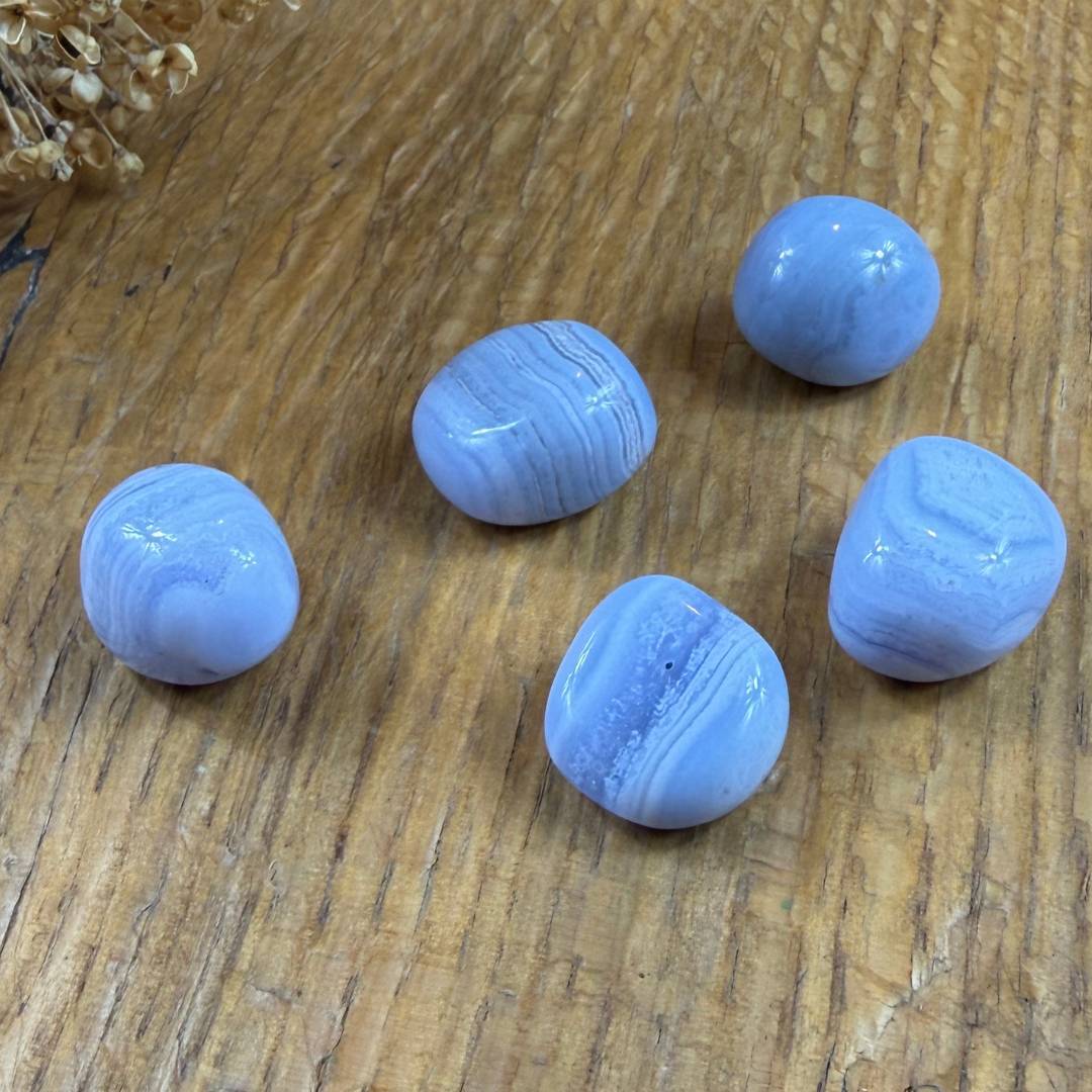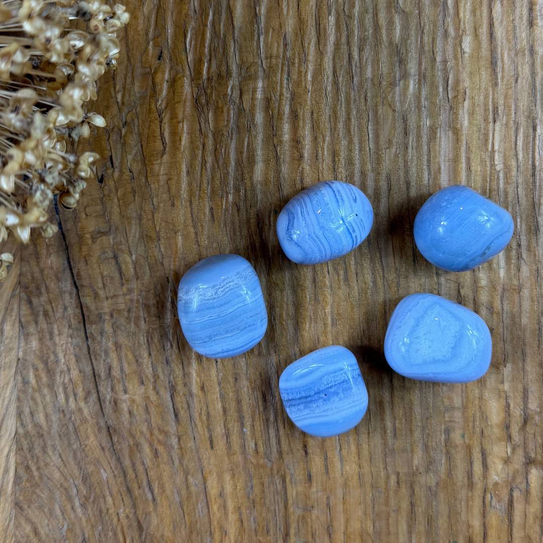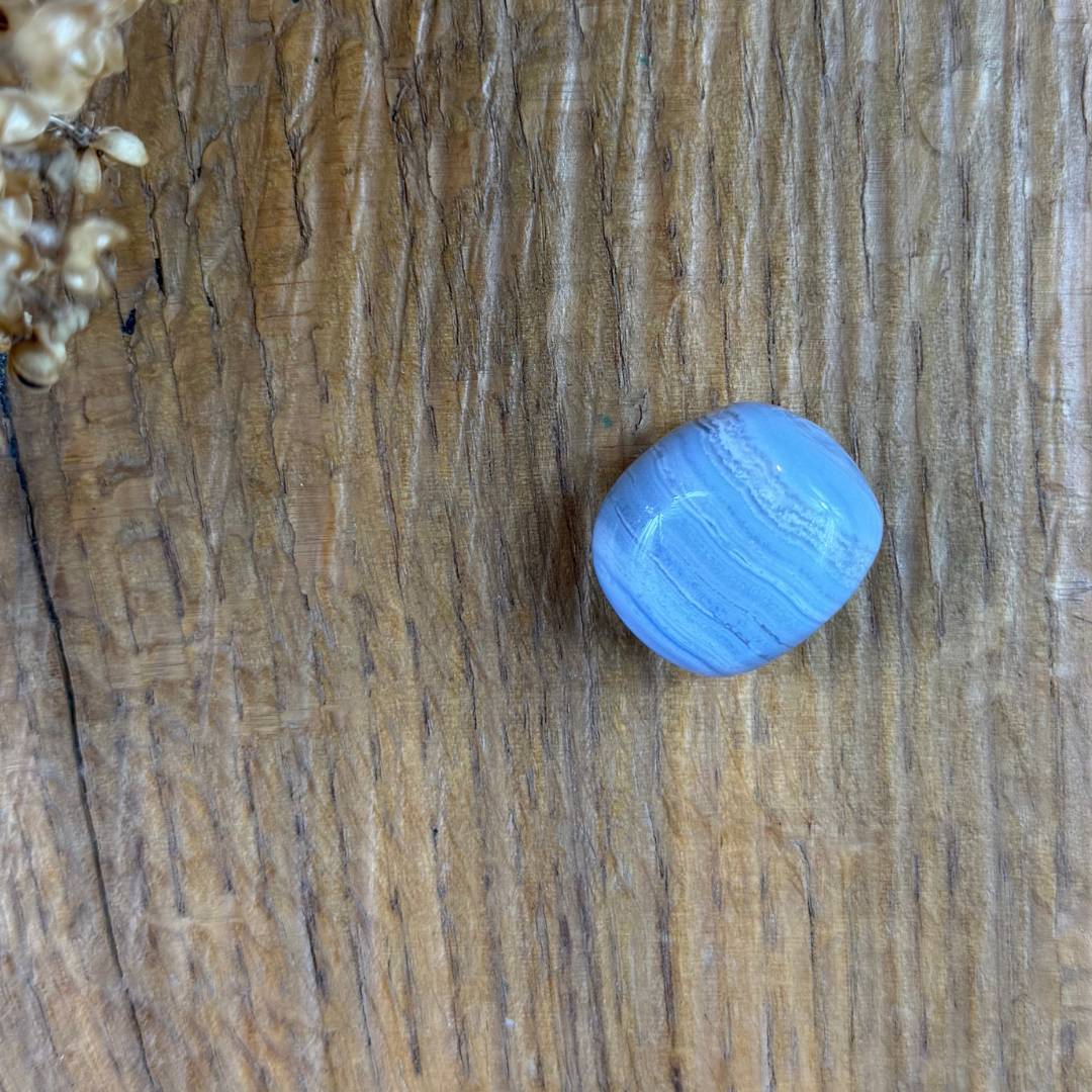 Der blaue Chalcedon (L 2,5, B 2, H 1,2 cm) steht symbolisch für Ruhe, Ausgleich und sanfte Kommunikation. Viele Menschen verbinden ihn mit innerer Harmonie und emotionaler Entlastung. Er erinnert daran, langsamer zu werden, dem eigenen Tempo zu vertrauen und mit sich selbst liebevoll umzugehen. Als Trommelstein liegt er angenehm in der Hand und eignet sich für bewusste Pausen, Rituale oder als stiller Begleiter im Alltag. Auf Wunsch wird der Heilstein von einem handgenähten schützenden Stoffsäckchen ergänzt, das es achtsam  aufbewahrt. Jeder Stein ist ein Naturprodukt und einzigartig.