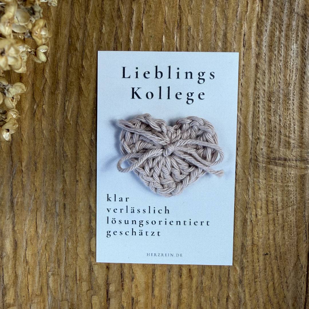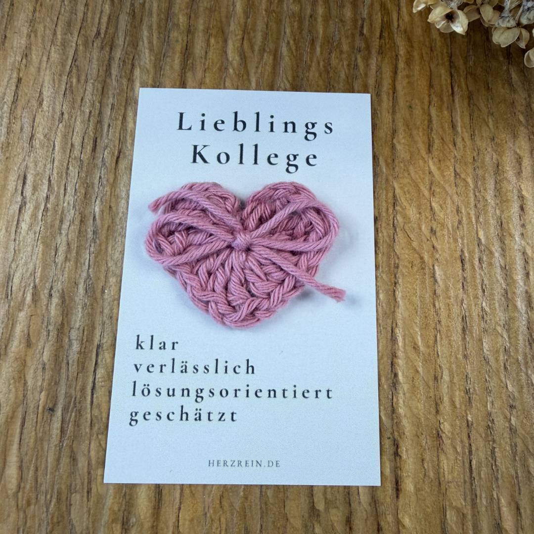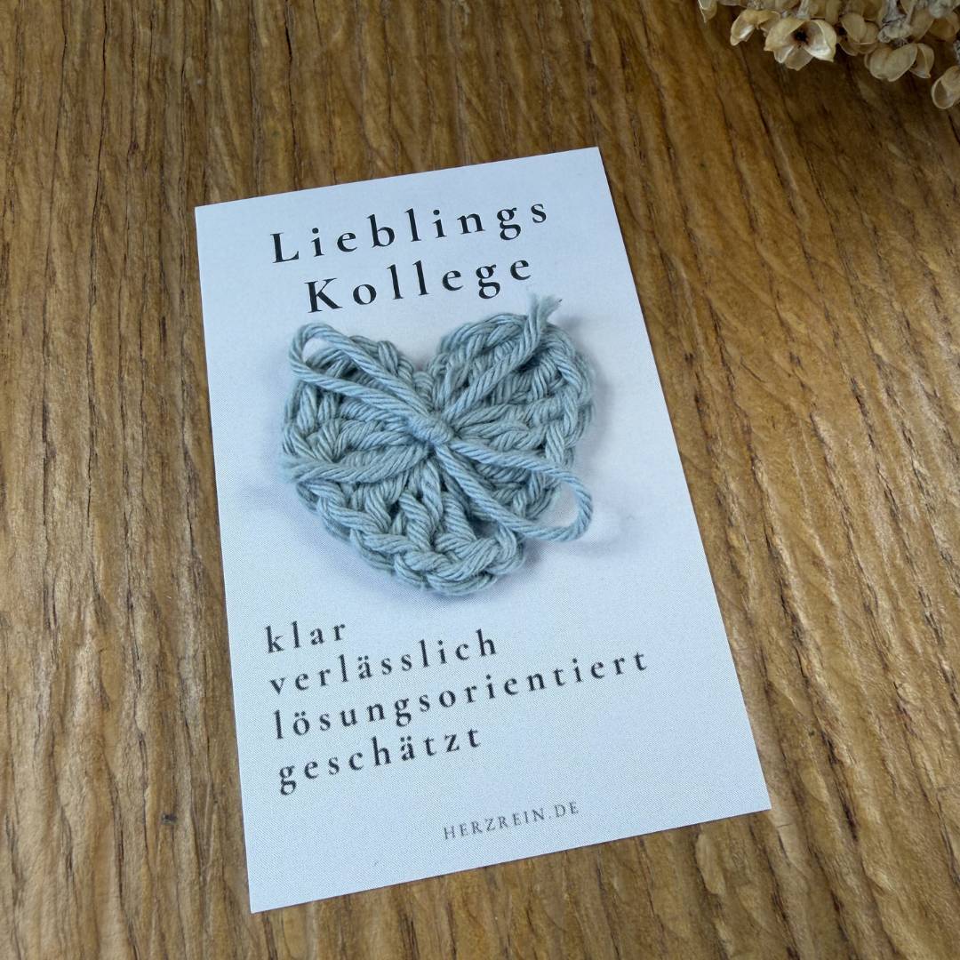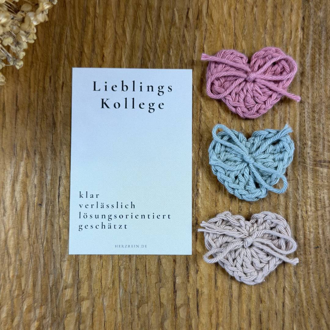 Mit der Herzreinkarte Lieblingskollege lässt sich diese Wertschätzung auf eine ruhige und ehrliche Weise ausdrücken. Sie verbindet eine klare Botschaft mit einem kleinen, von mir handgehäkelten Herz und wird so zu einer besonderen Geste.