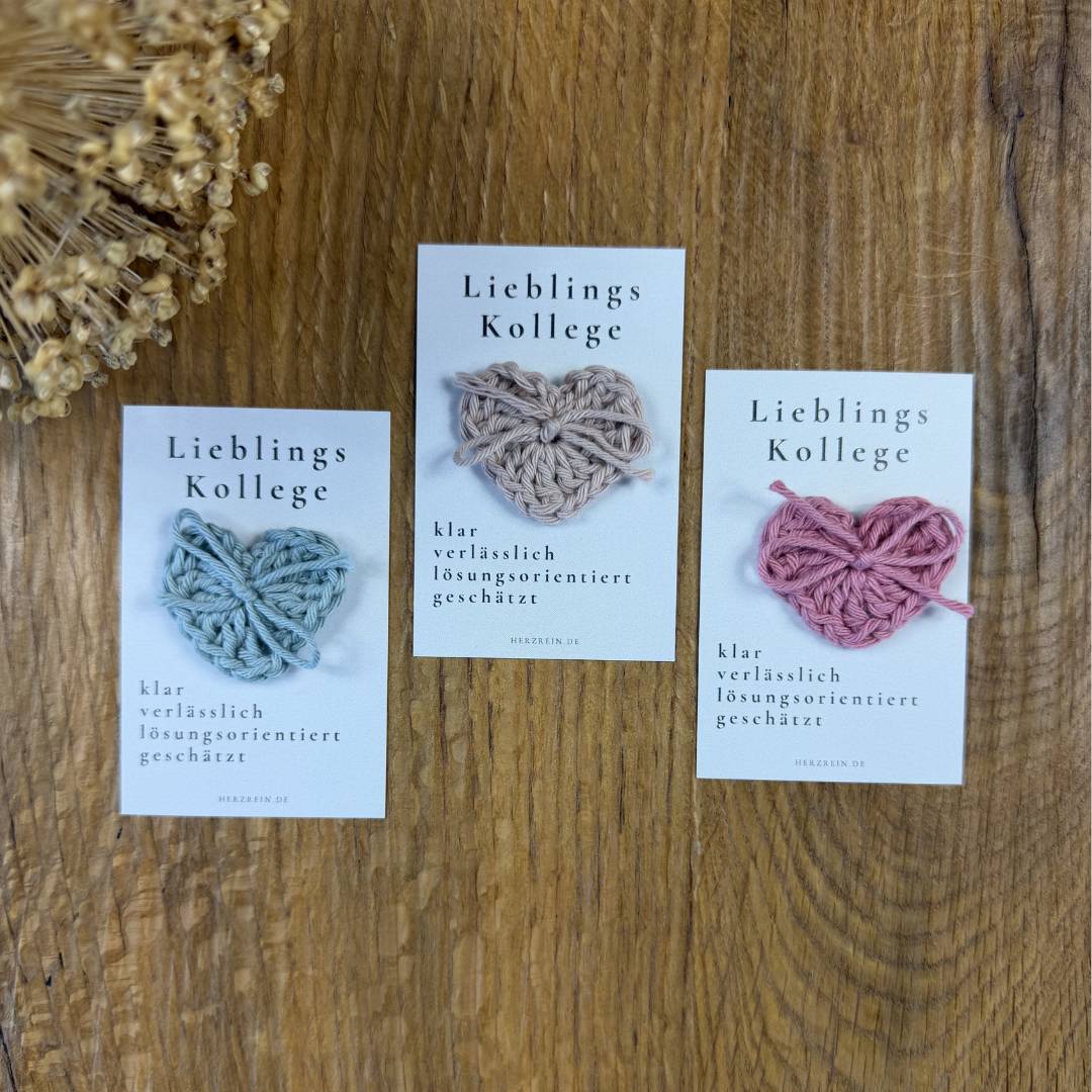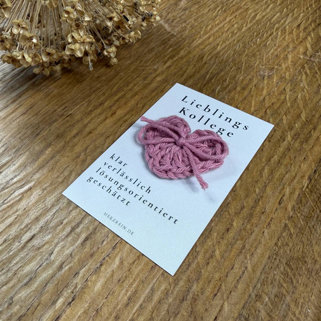 Jede Herzreinkarte Lieblingskollege wird mit viel Sorgfalt vorbereitet. Das gehäkelte Herz entsteht in Handarbeit und macht jede Karte zu einem individuellen Stück.