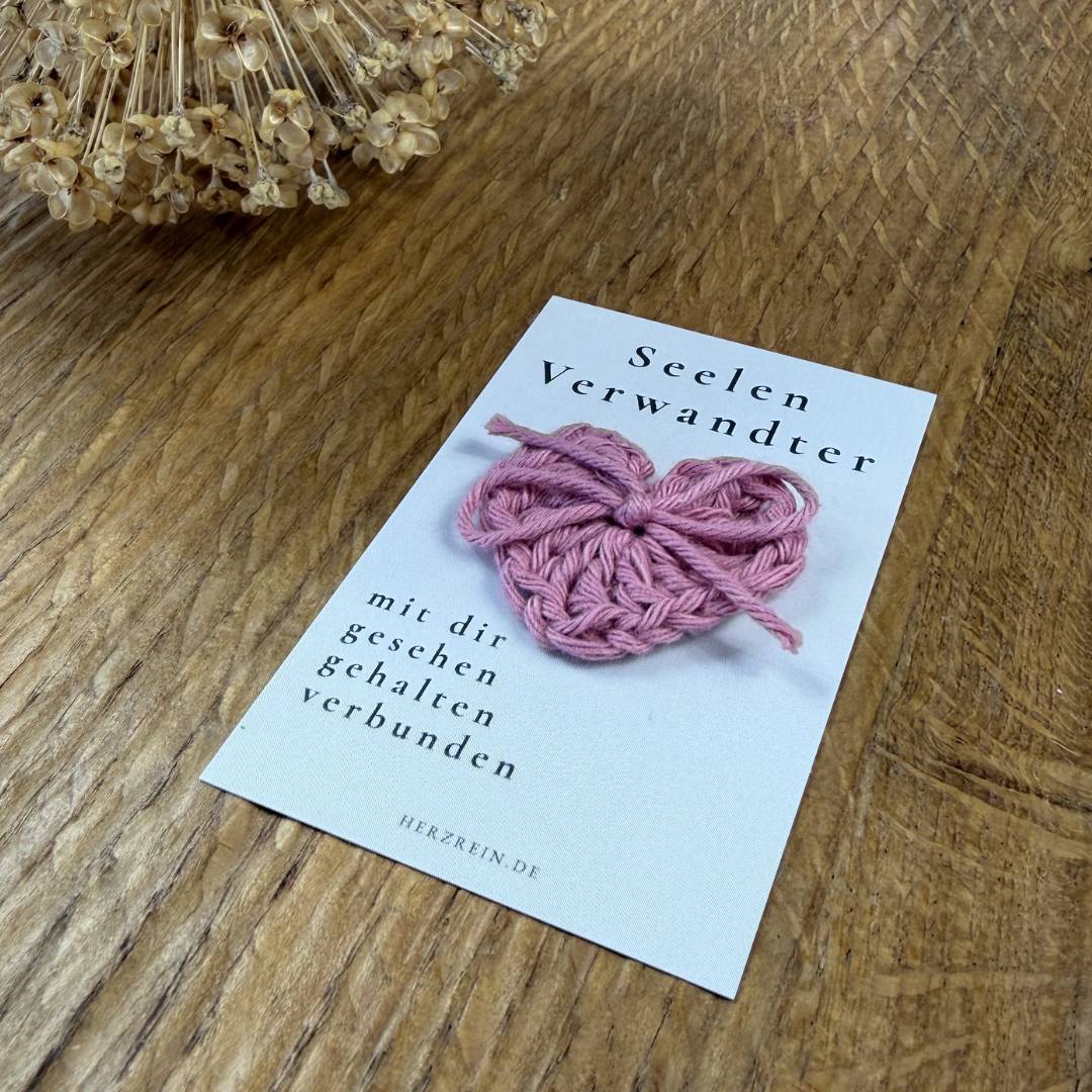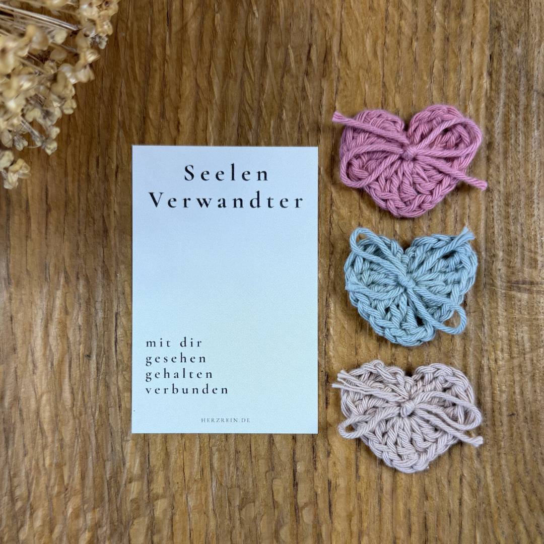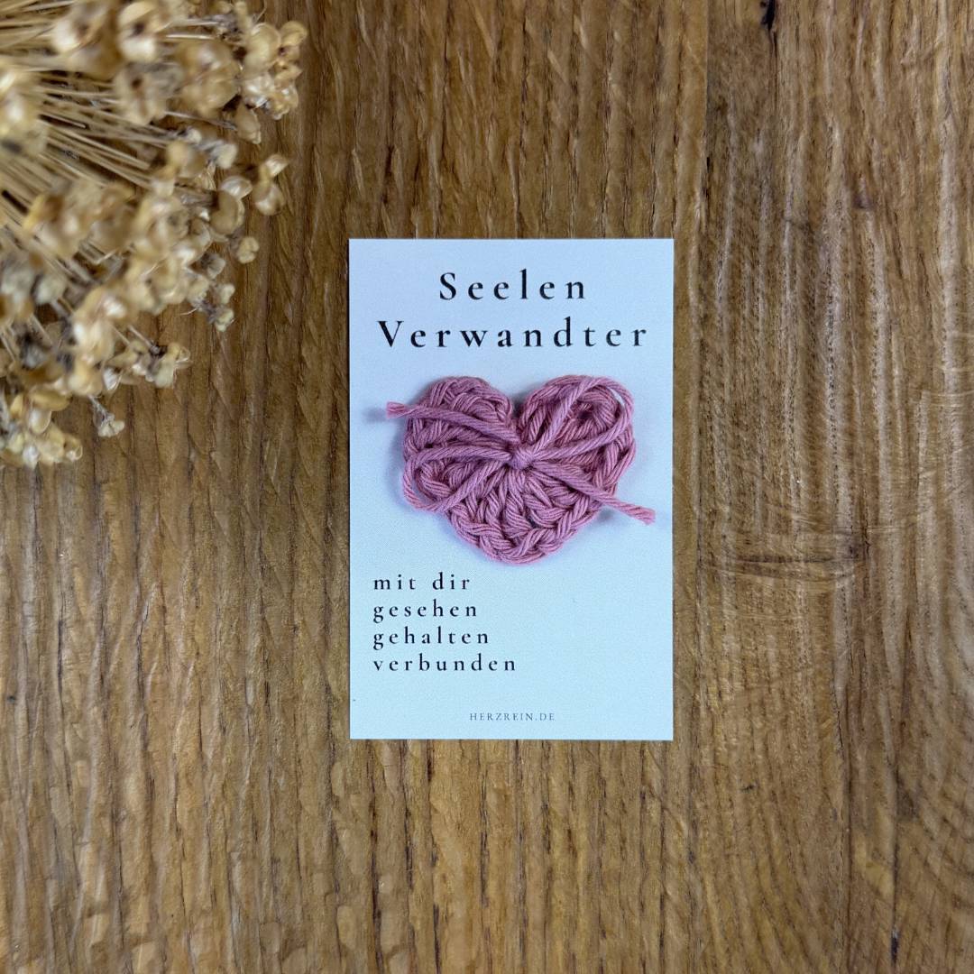 Mit der Herzreinkarte Seelenverwandter kannst du genau dieses Gefühl auf eine ruhige und ehrliche Weise ausdrücken. Sie verbindet eine achtsame Botschaft mit einem kleinen, von mir handgehäkelten Herz und wird so zu einem stillen Zeichen von Nähe und Vertrauen.