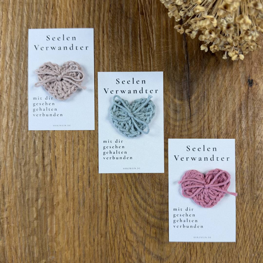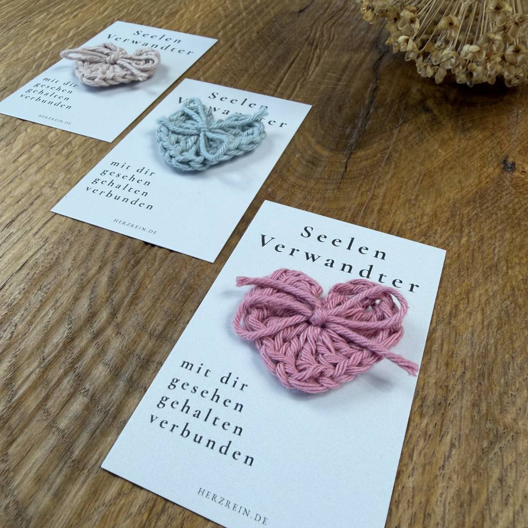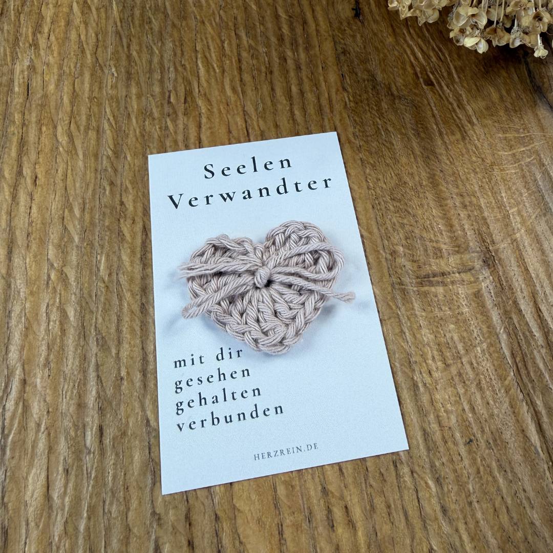 Mit der Herzreinkarte Seelenverwandter kannst du genau dieses Gefühl auf eine ruhige und ehrliche Weise ausdrücken. Sie verbindet eine achtsame Botschaft mit einem kleinen, von mir handgehäkelten Herz und wird so zu einem stillen Zeichen von Nähe und Vertrauen.