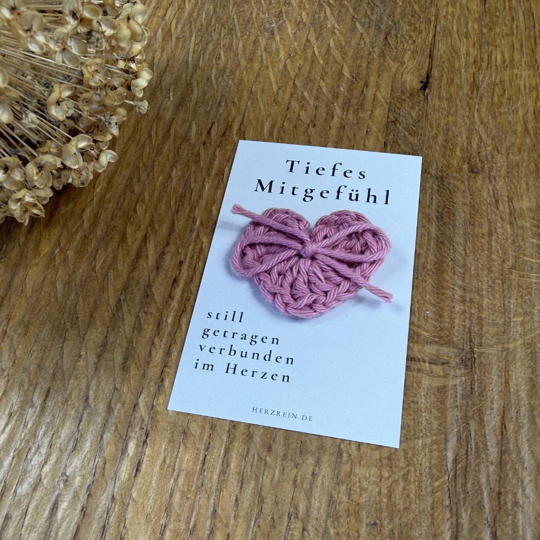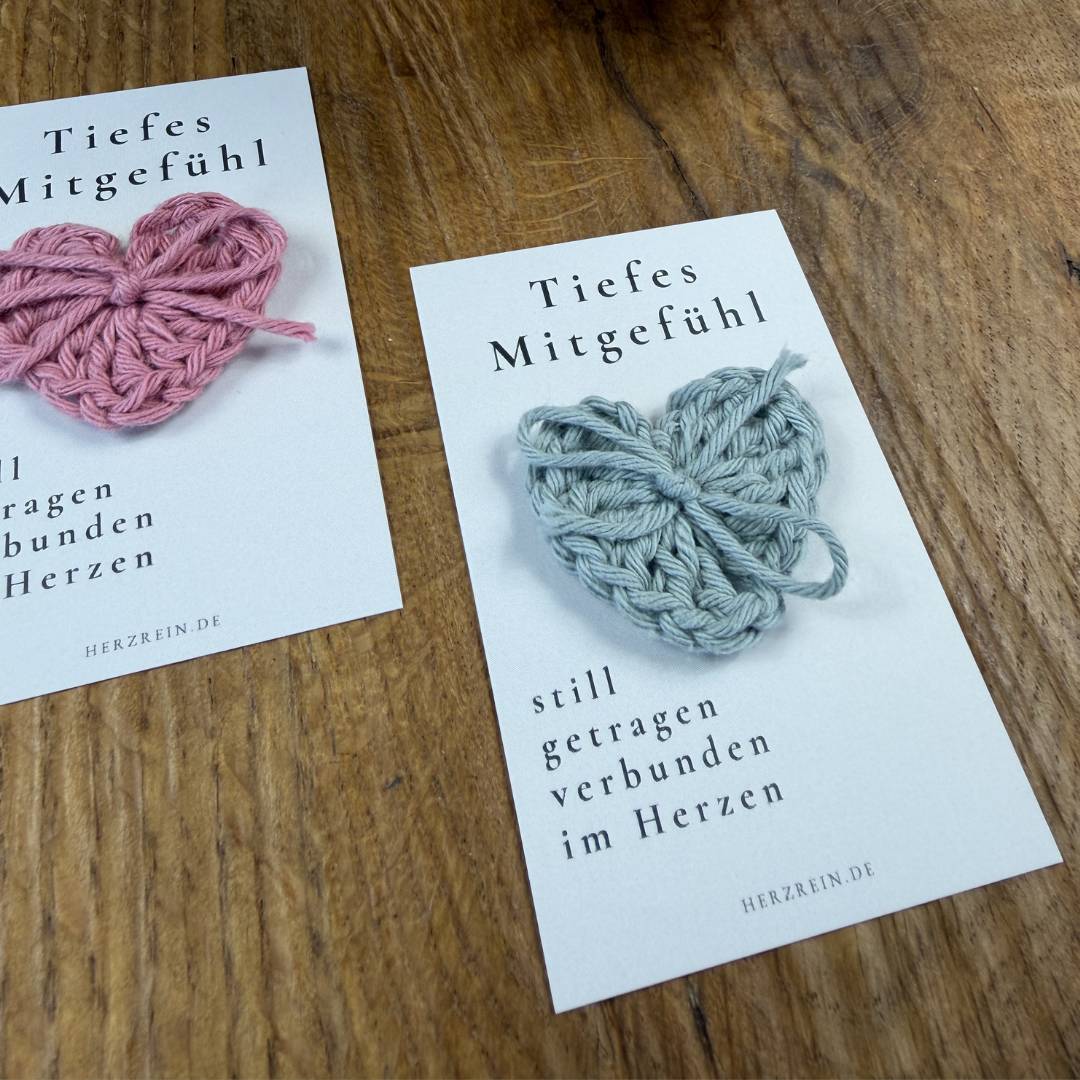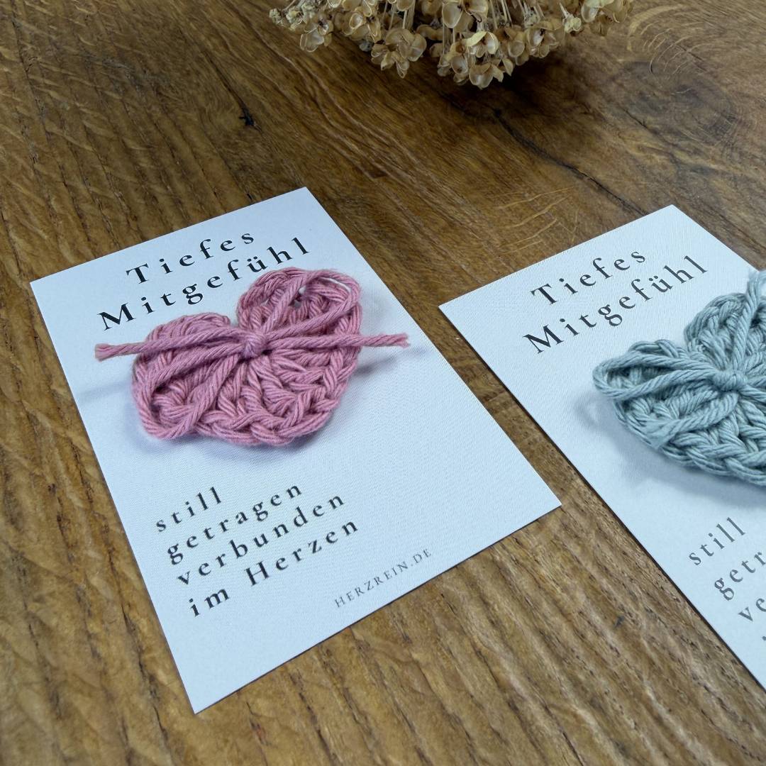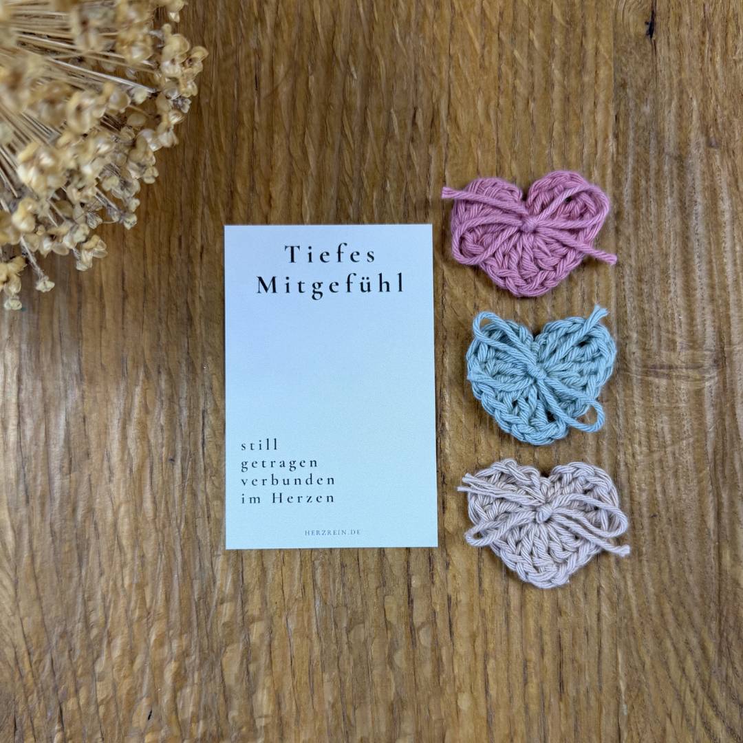 Jede Herzreinkarte Tiefes Mitgefühl entsteht in sorgfältiger Handarbeit. Das gehäkelte Herz fertige ich selbst und jede Karte wird mit viel Ruhe vorbereitet.