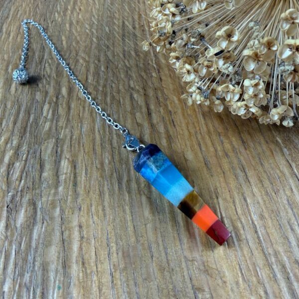 Das Pendel besteht aus verschiedenen Steinen (ca. 4,2 cm), die traditionell den sieben Chakren zugeordnet werden, und wird von einer feinen Kette (ca. 20 cm) ergänzt. Die Kombination der Materialien unterstützt eine ruhige Pendelbewegung und eine konzentrierte Nutzung im Alltag.