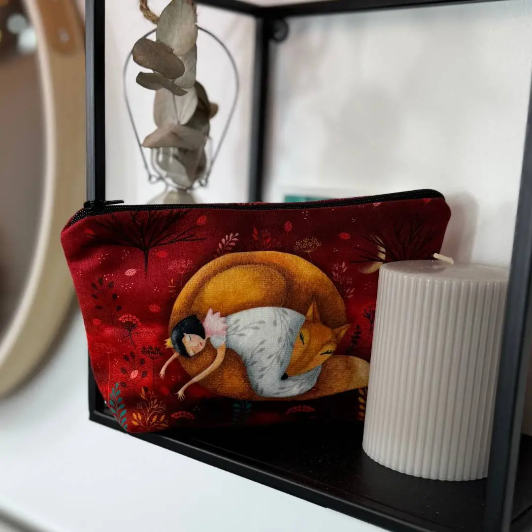 Schminktasche Geborgenheit – mehr als nur eine Aufbewahrung für deine Dinge. Sie ist ein zarter Begleiter, der dich an Momente erinnert, in denen du dich ganz in Sicherheit fühlst. Das Design zeigt eine Frau in weißem Kleid und eine sanft ruhende Szene mit einem Fuchs. Beide sind verbunden durch einen stillen, unsichtbaren Faden aus Vertrauen. Der warme Rotton des Hintergrundes umhüllt dich wie eine weiche Decke, während der sanfte Schein des Mondes leise Magie in deinen Alltag trägt. Gefertigt aus hochwertigem, bedrucktem Samtstoff – weich im Griff und dennoch robust – wird sie dich viele Jahre begleiten. Mit ca. 20 cm Breite und 13 cm Höhe bietet sie Raum für Kosmetik, Ritualgegenstände, Herzensschätze, Notizen, Schmuck oder kleine Alltagshelfer. Das Innenfutter schützt den Inhalt, der Reißverschluss öffnet und schließt sanft.