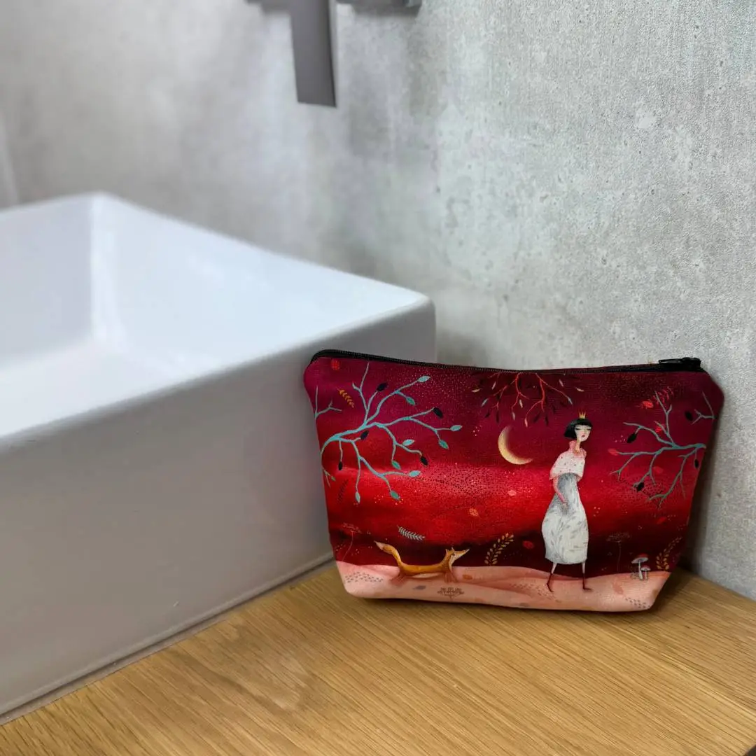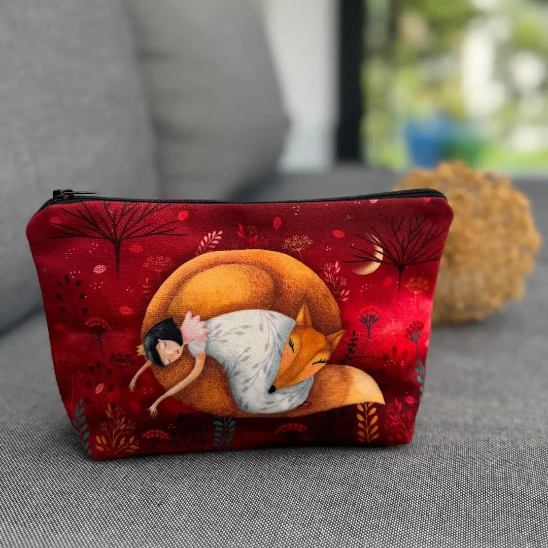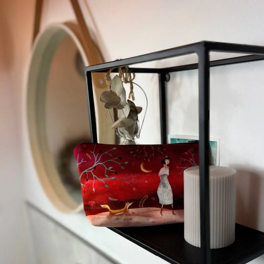 Design: Schminktasche Geborgenheit – Frau, Fuchs, roter Mond, symbolische Bäume
